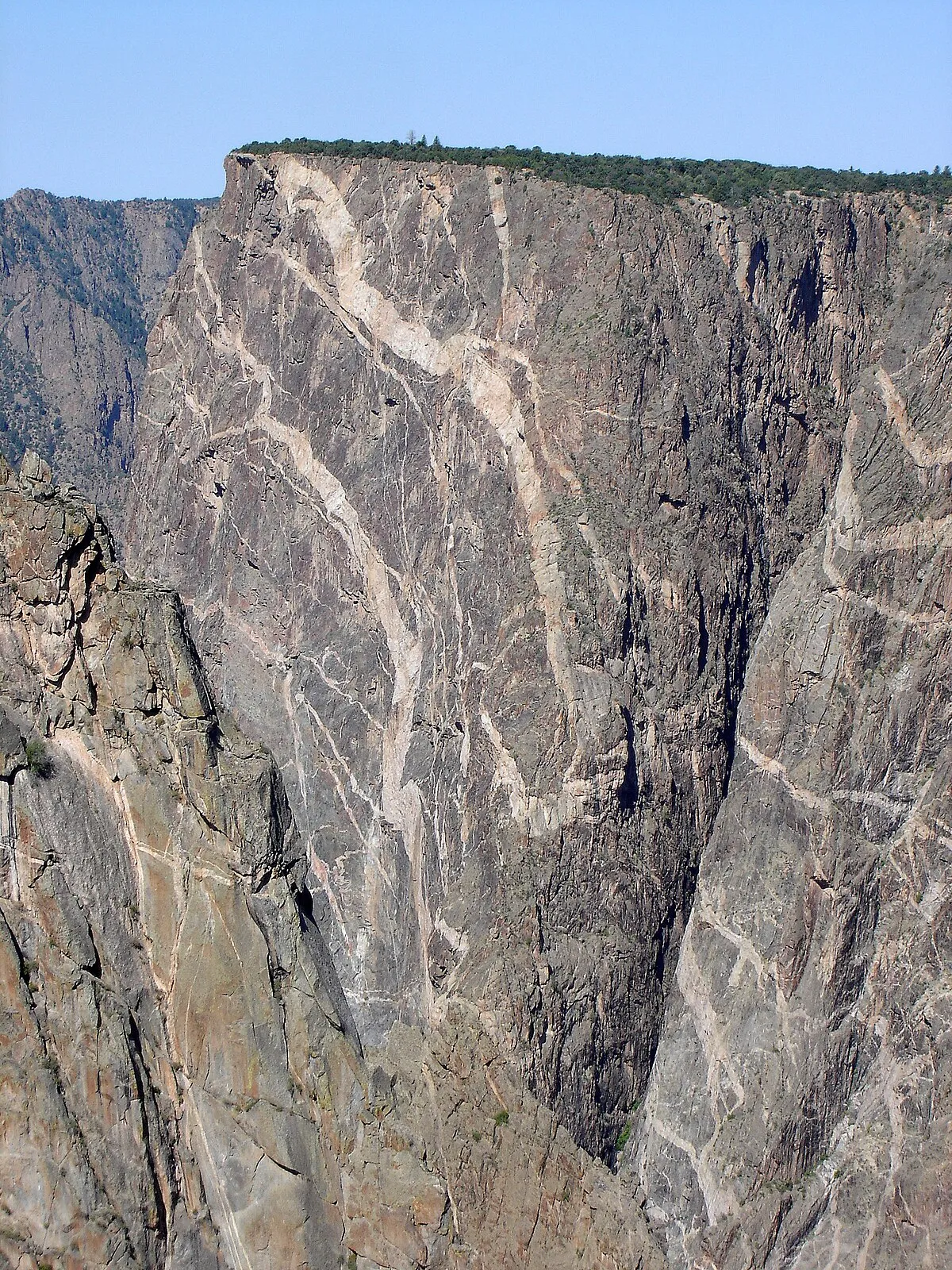 The Painted Wall overlook isn't just another scenic viewpoint – it's a geological masterpiece that tells the story of Earth's ancient history. Located in Black Canyon of the Gunnison National Park, this towering cliff face rises an astounding 2,250 feet from the Gunnison River below, making it the tallest cliff in Colorado and one of the most impressive in North America.